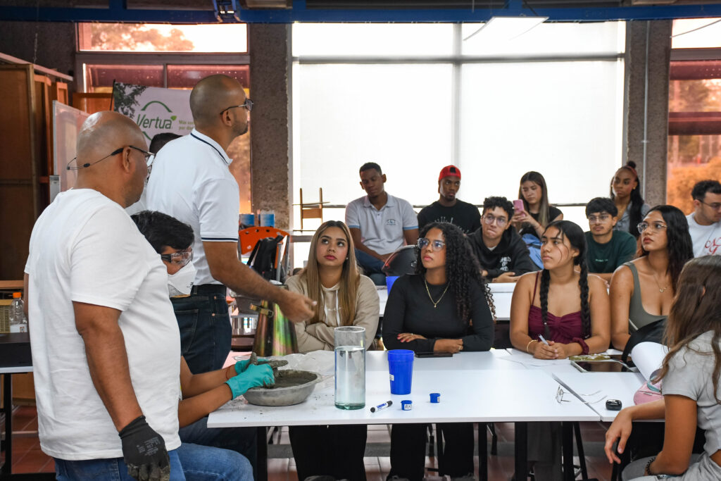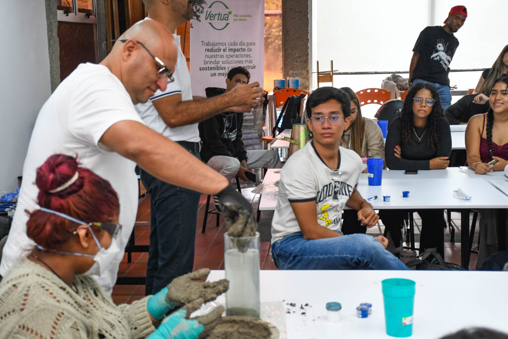 Posteriormente, los estudiantes participaron en un ejercicio práctico, en el que realizaron mezclas de concreto utilizando distintos aditivos y pigmentos, con el fin de observar cómo estas variaciones influyen en el comportamiento del material.